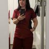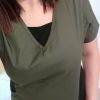 - 97% Cotton/ 3% Spandex Stretch side panels Machine Wash Cross-over v-neck top with set-in sleeves Two front pockets
