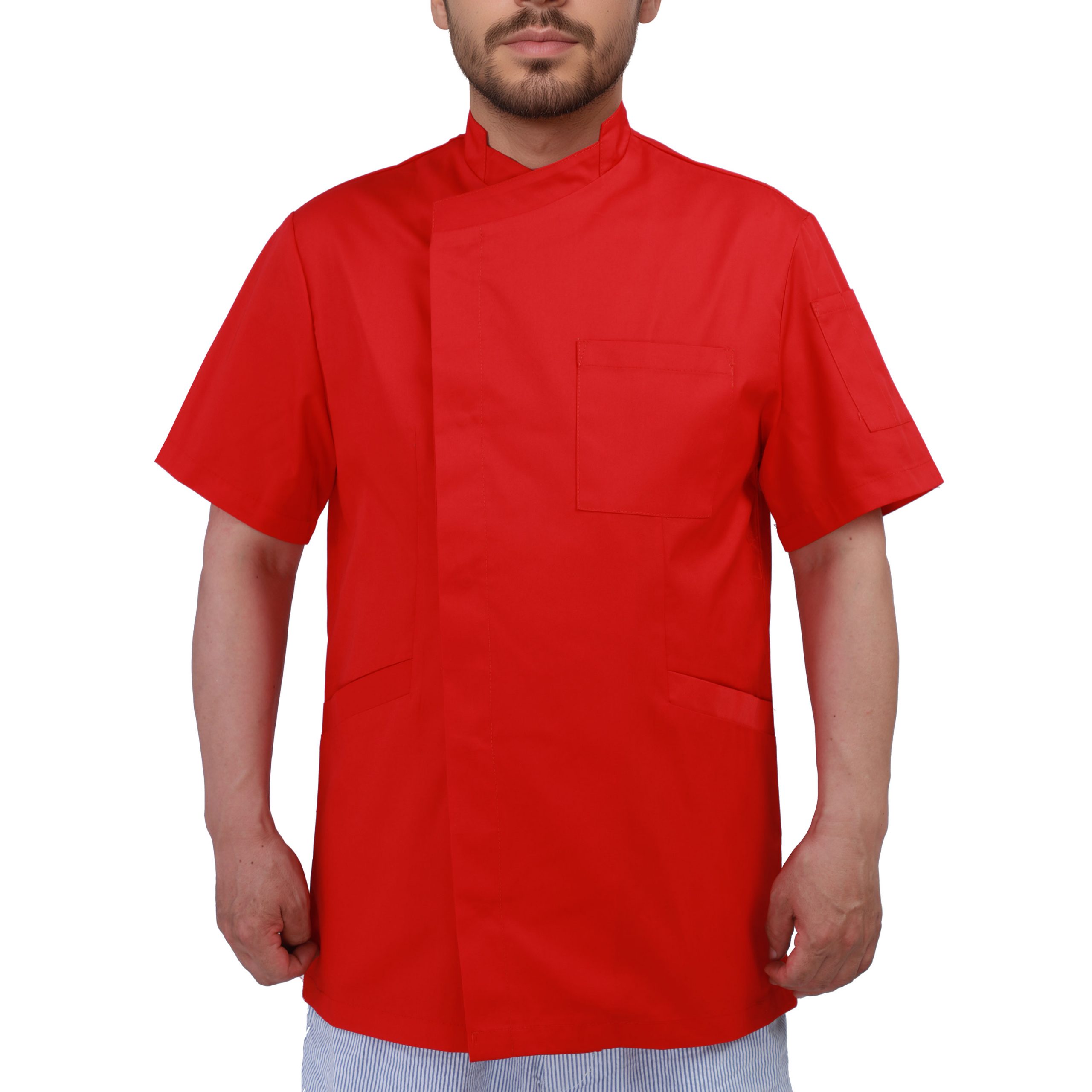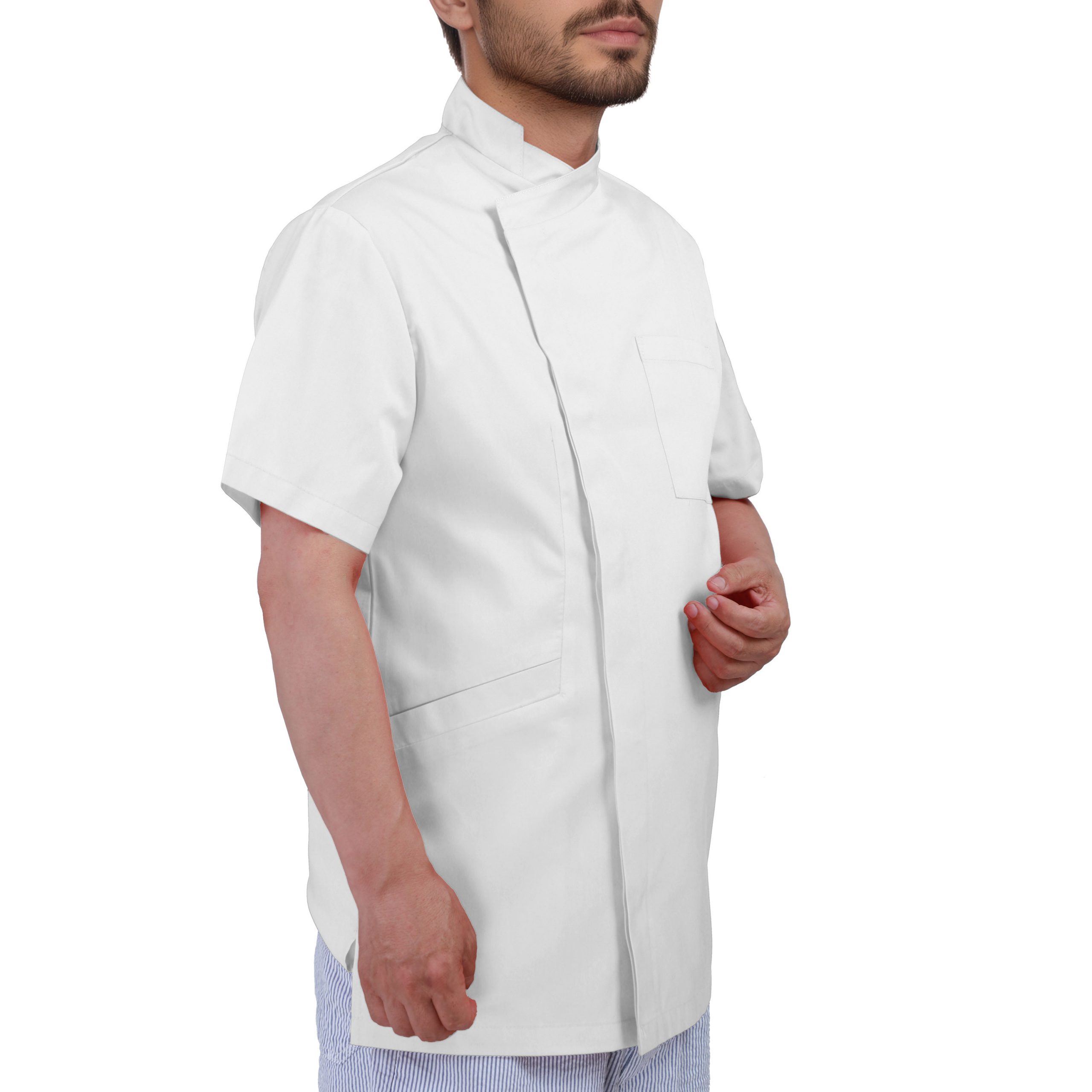 A professional short-sleeve chef coat designed for busy kitchens. Features a stand-up mandarin collar, snap-front closure and contrast piping for a clean, modern look. Practical storage with two front pockets, one chest pocket and patch sleeve pockets. Durable, easy-care fabric — machine wash and tumble dry. (65% Polyester, 35% Cotton)