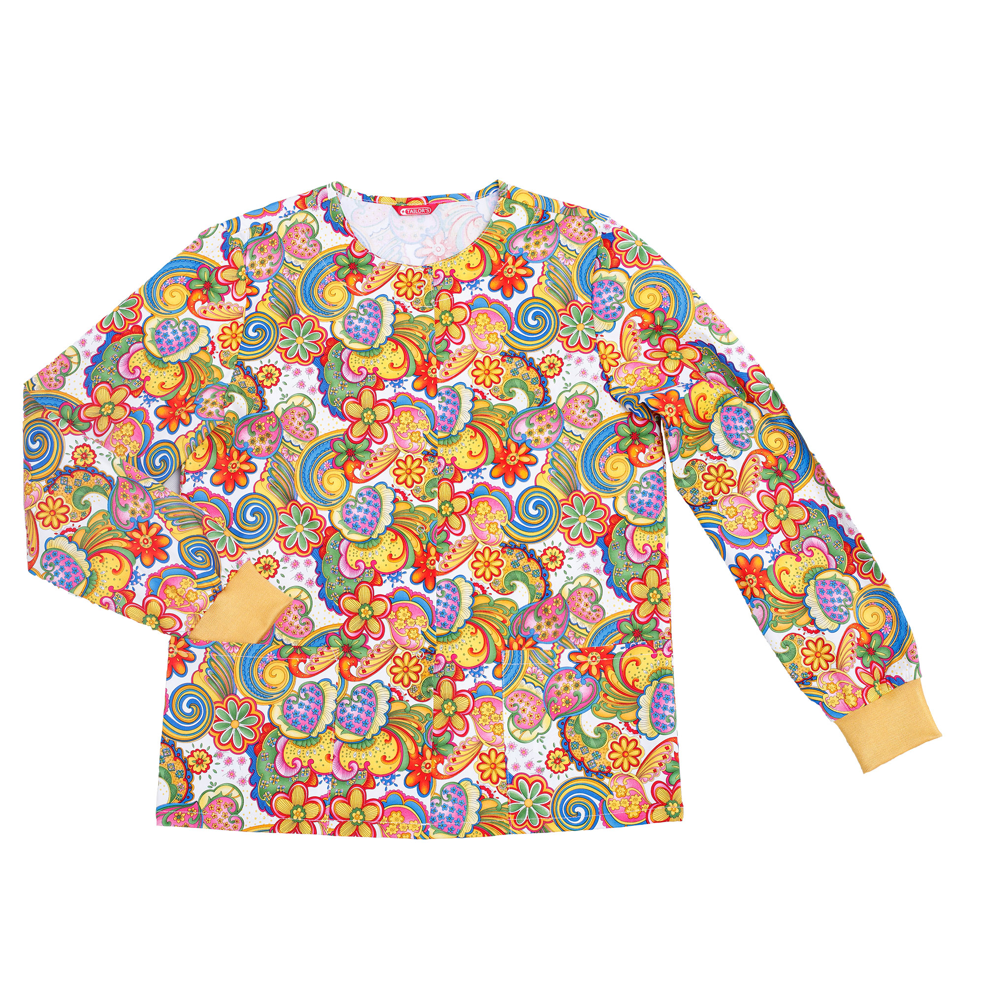 Women’s Long Sleeve Warm Up Scrub Jacket. Round neck. Snap closure. Three Patch Pockets. Machine wash and dry.