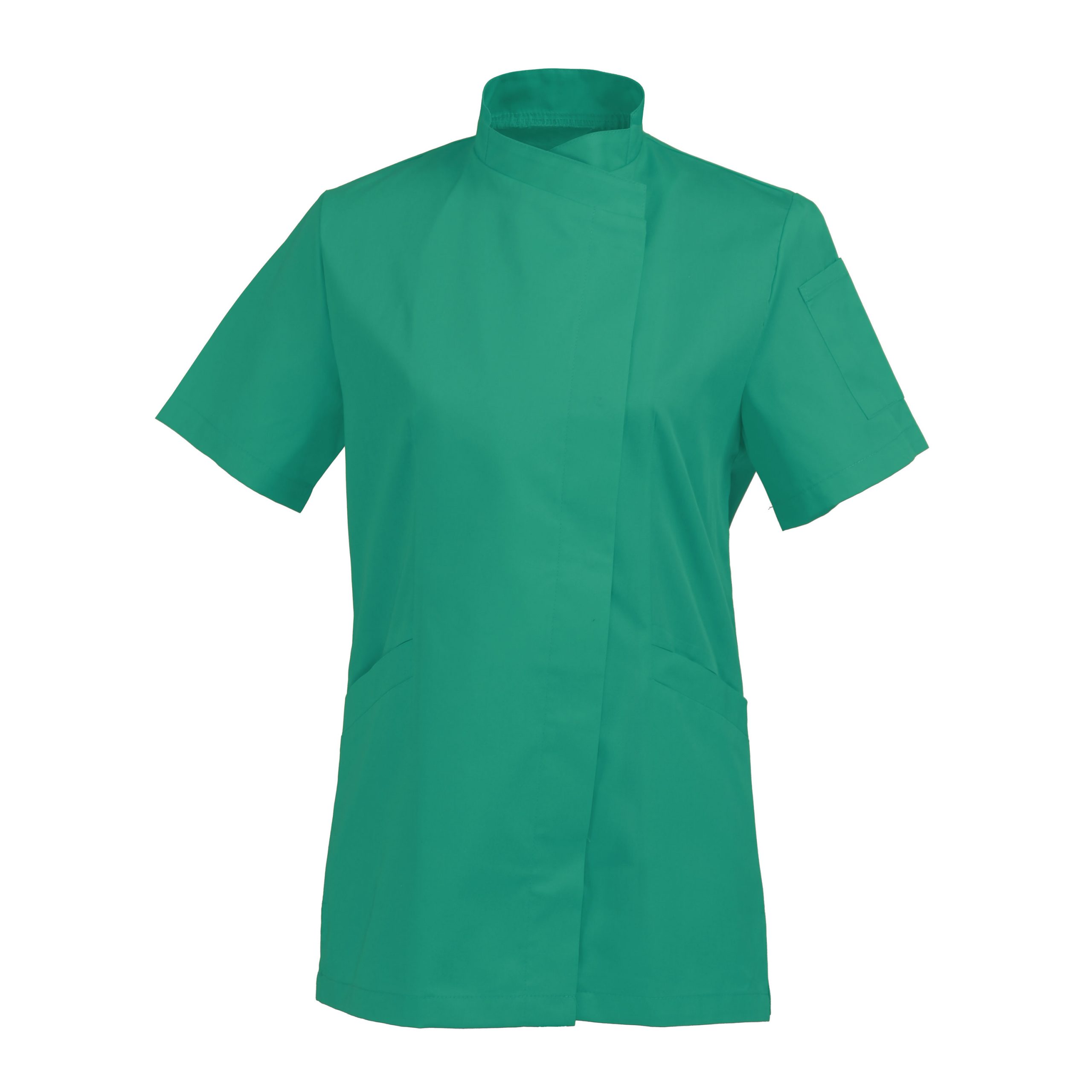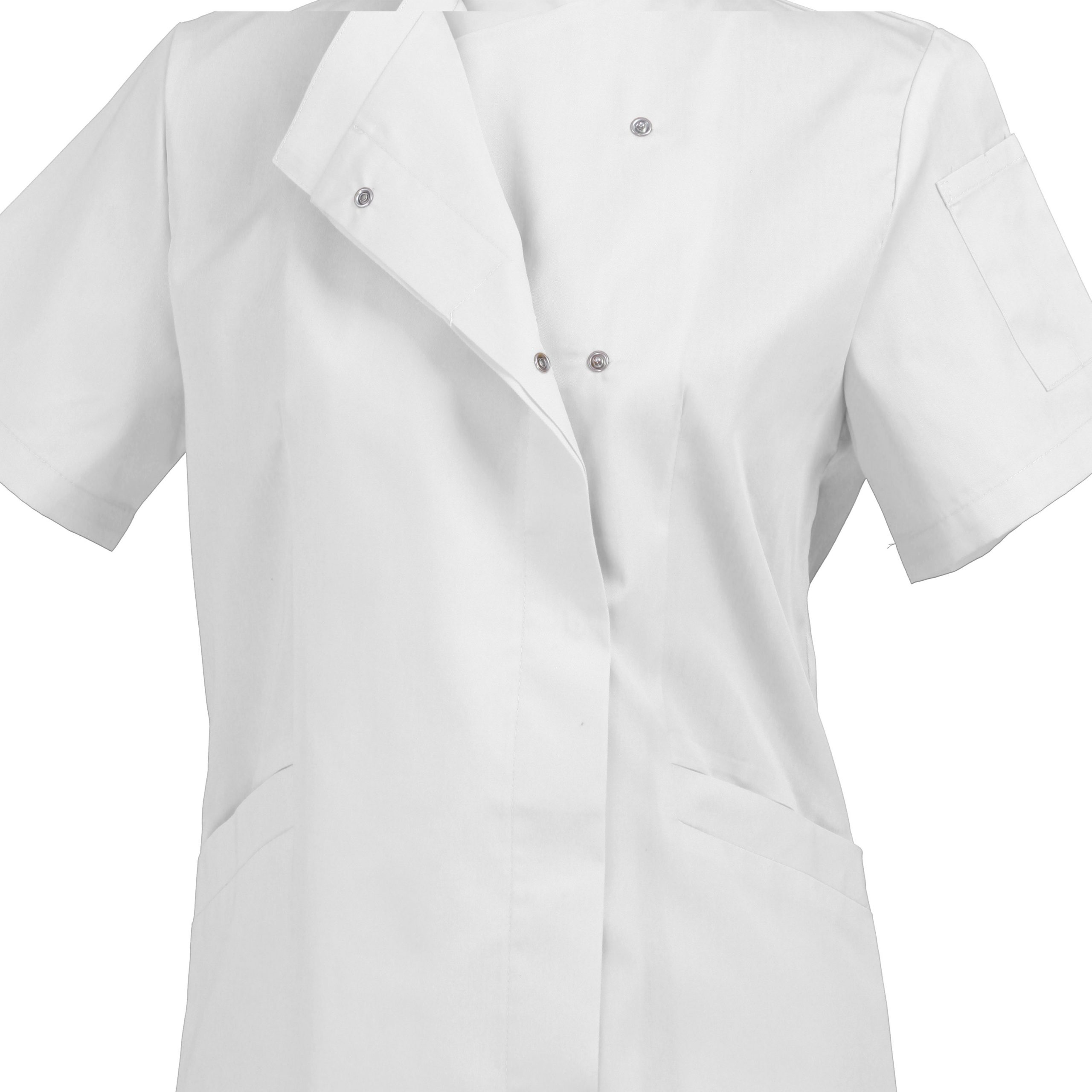 A modern, professional chef coat designed for female chefs and hospitality staff. The stand-up mandarin collar gives a neat, contemporary look while contrast piping adds a refined touch. Practical details include a patch pocket on the sleeve for pens or thermometers, snap front closure for fast on/off, and two roomy front pockets for tools. Comfortable, easy-care fabric and a women’s cut make this jacket ideal for busy kitchens, cafés and catering. Machine wash and tumble dry for quick turnover.